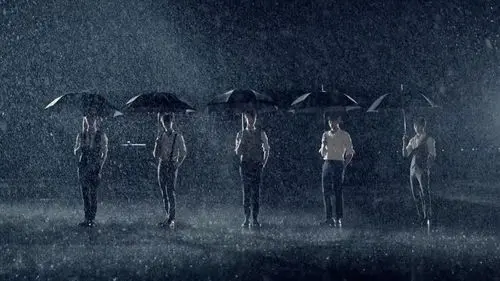 In the video, KNK members are holding black umbrellas while standing in the pouring rain.