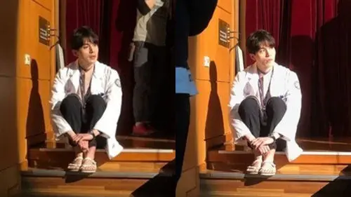 In the pictures, Lee Dong Wook sits uncomfortably on the stairs and zones out looking bored.