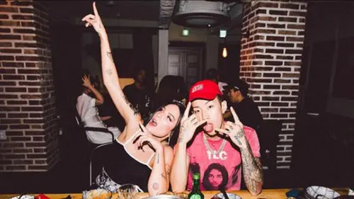 In the picture, Jay Park and Halsey are at a Korean-style pub, and Halsey comfortably leans against Jay Park's shoulders.