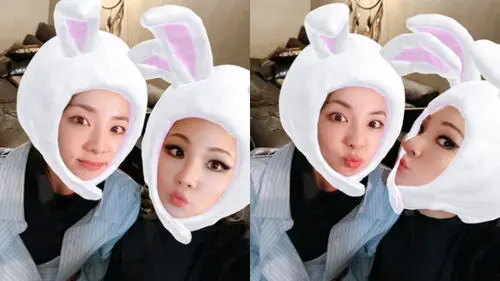 In the pictures, DARA and CL make playful poses using a camera filter that makes them become adorable rabbits.