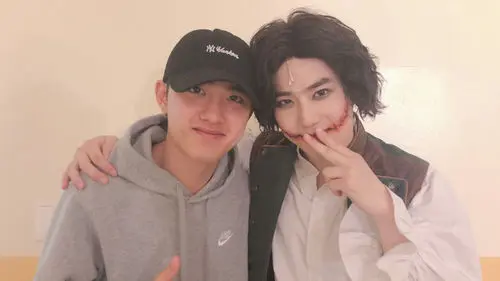 In the photo, SUHO is dressed as the role of 'Gwynplaine' in his musical 'The Man Who Laughs' and has his arm around D.O.'s shoulders.