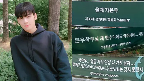 It is assumed that these students wanted Cha Eun-woo to snap a photo in front of their banners, as he has snapped a photo in front of one in May.