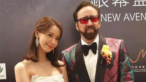 In the picture, Yoona and Nicolas Cage smile next to each other in front of the step and repeat at 'International Film Festival & Awards Macao'.