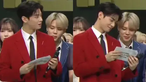 K-pop boy group ASTRO's Cha Eun-woo helped another boy group BTS' JIMIN to figure out the next stage of a music festival by letting him taking a quick look at his cue sheet.