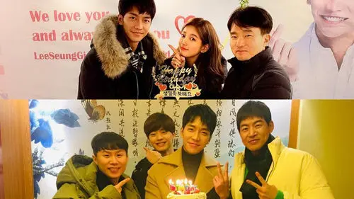 In the first picture, Lee Seung Gi is cutting a big birthday cake next to Suzy and the director of their upcoming drama 'VAGABOND' in front of a large banner which is written with a congratulatory birthday message to Lee Seung Gi.