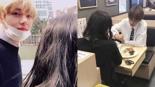 The second photo was of V and the same person in long hair having some pork cutlet in a restaurant.