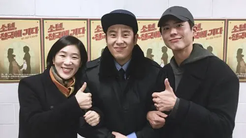 The picture was of P.O with Baik Ji-won and Park Bo Gum in front of posters for P.O's play 'A Boy Goes to Heaven'.