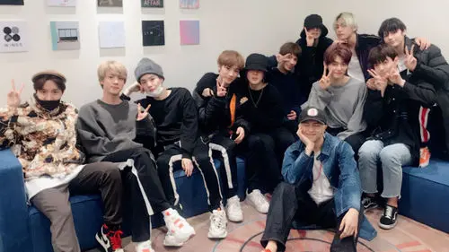 The photo was of the five members of TXT and seven members of BTS posing in a room where it is decorated with album covers of BTS on the wall.