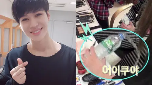 While doing so, one make-up artist accidentally knocks a water bottle over and spills water on TAEMIN's lap.