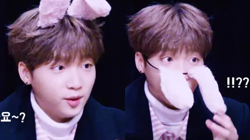 At the fan signing event, Jeong Sewoon gladly put a bunny headband from a fan on his head.