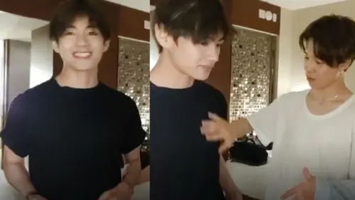 As he noticed V had bulked up, JIMIN started to feel his muscles and would not stop staring at his body.