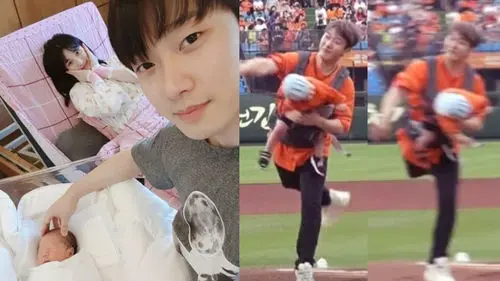 Choi Min Hwan first sang the national anthem at the game with his wife Yulhee and his son Jae Yul by his side, and threw the first pitch while holding his son in a baby carrier.