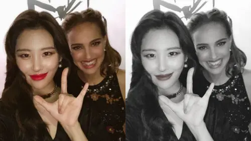 In the photo, SUNMI makes a rock sign looking happy and Natalie Portman broadly smiles at the camera as well.