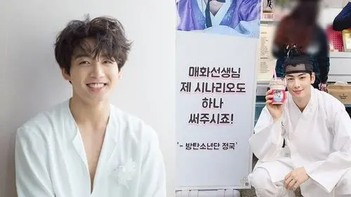 On July 26, Cha Eun-woo shared pictures of himself posing in front of a coffee truck along with a caption saying, "Come on here, JUNGKOOK. Let's eat and have fun :)" In the pictures, Cha Eun-woo was expressing his gratitude to his dear friend JUNGKOOK while taking a close look at the generous gift he sent him. On top of the truck, there was a banner that said, "Come on here, Yi Rim. Let's eat and have fun. Enjoy your coffee and good luck with your shooting! Go Eun-woo!" In Korean, the name of Cha Eun-woo's character 'Yi Rim' and the phrase "Come on here" have the same initial and it seems like JUNGKOOK wanted to take advantage of that while coming up with a message to show his support. JUNGKOOK must have done his research before preparing all this since the second banner that was placed next to the truck said, "Mae Hwa, please write me a script too. From BTS JUNGKOOK."
