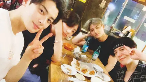 The photo showed JUNGKOOK having a meal at a restaurant with Cha Eun-woo of ASTRO, MINGYU of SEVENTEEN and YUGEOM of GOT7.