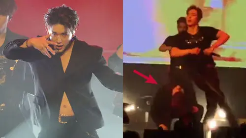 Fellow MONSTA X members approached to WONHO in worry, but WONHO managed to complete the entire performance until he was being escorted out of stage.
