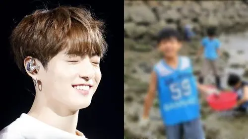 Recently, one fan discovered a new set of baby JUNGKOOK's photos and shared them on Weverse, BTS' new global fan community. In the photos, baby JUNGKOOK is wearing a blue jersey and grey sweatpants, spending a day at the beach to catch some clams and oysters by the seaside.