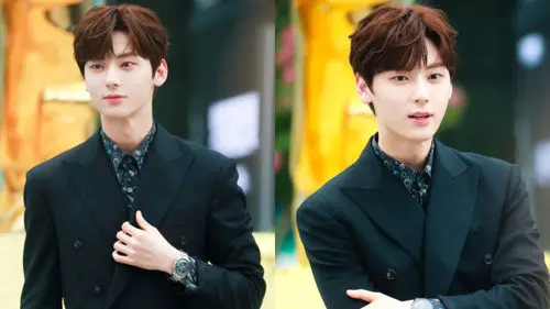 On this day, MINHYUN appeared with greatly-styled hair and a simple yet fashionable black suit, making him look elegant.