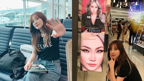 On September 9, DARA took her Twitter to share two photos of herself that were taken at the airport. In the photos, DARA is posing in front of an advertisement board featuring CL for one cosmetics brand. Along with the photos, DARA wrote, "I came to the airport but there was a photo of my friend, so I took a picture."