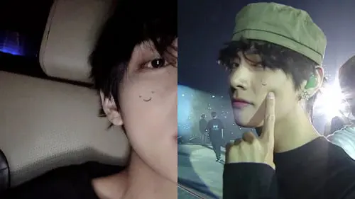 When V returned to the stage, he walked towards a camera, pointed at his left cheek and smiled.
