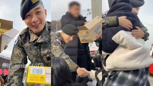 When he was going around delivering 'Baebae' biscuit boxes, he made small talk with each fan, and either shook hands or hugged them as well.