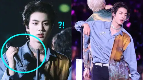 In the middle of the performance, however, the top of JIN's microphone stand suddenly came off.