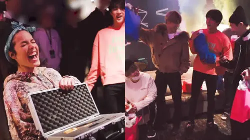 When they were standing around together, BTS handed a thick black case that had "Halsey" written in sparkly pink.