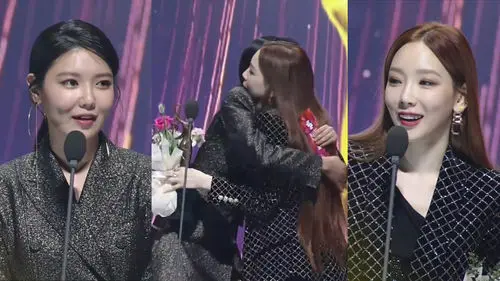 When her name was called, Taeyeon went up to the stage and received her trophy and bouquet from Sooyoung, and the two Girls' Generation members shared a hug. What made the entire audience and their fans all go "Awww!" was when Taeyeon handed a white rose that she brought from her table to Sooyoung. As her award acceptance speech, Taeyeon said, "I will continue to sing hard if my voice helps any drama or scene. And thank you, Sooyoung, for giving me this award. I would also like to say thank you to my fans. I love you!"