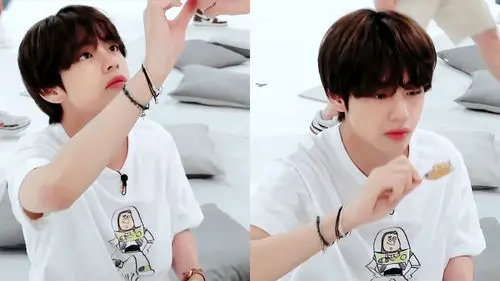 When carefully eating the ppopgi, V got unexpectedly approached by his fellow members asking if they could try his ppopgi.