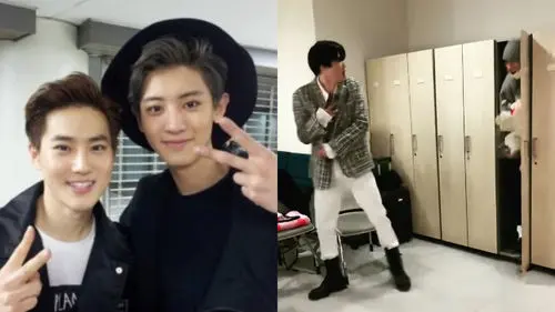 At the beginning of the video, SUHO was busy talking to his staff in his waiting room for a music show.
