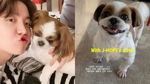 On the other hand, Mickey always looks like the happiest dog on the planet in photos taken by J-HOPE's sister.