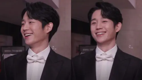 Jung Hae In was wearing a black tuxedo with a white bow tie, looking very stylish.