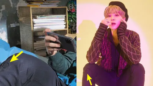 It seemed like JIMIN had decided to continue wearing the pants by patching the hole on the knee with a black cloth.