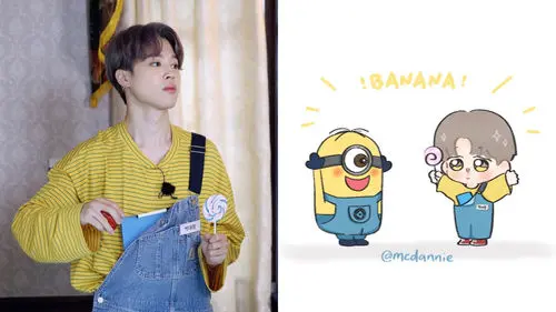 In recent episode of BTS' online variety show 'Run! BTS', JIMIN wore a Minion-like outfit with a striped yellow T-shirt and denim overalls. In response, Minions' official Twitter retweeted JIMIN's photos with yellow heart and lollipop emojis.