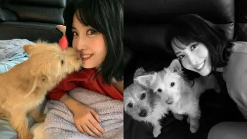 In her post, MOMO included photos of herself taken with her two dogs.