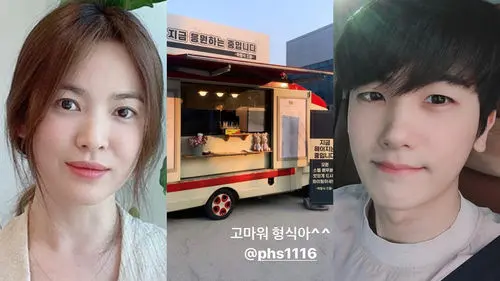 In the next photo, Song Hye Kyo held a cup of drink in her hand that said, "Here's my support to Hye Kyo noona and the team of 'We Are Breaking Up Now'. From Park Hyung Sik."