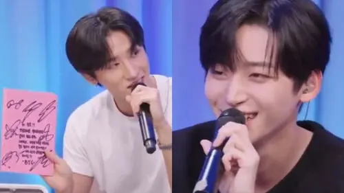 When I.M asked JUNGMO if he could show the listeners what his all-time favorite item was, he took out BTS' signed album that he received some years ago.