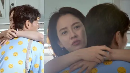With her arms wrapped around Kim Jong-kook's neck, Song Ji-hyo said, "I'm so hungry, oppa. Ah, looking at those side dishes over there makes me want to eat something really badly."