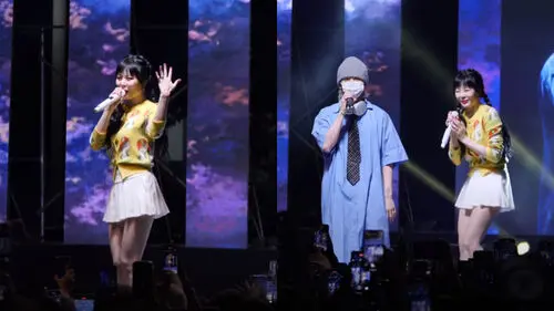As HyunA looked at backstage and said, "Baby" into the microphone, DAWN came up to the stage and gave her a hug.