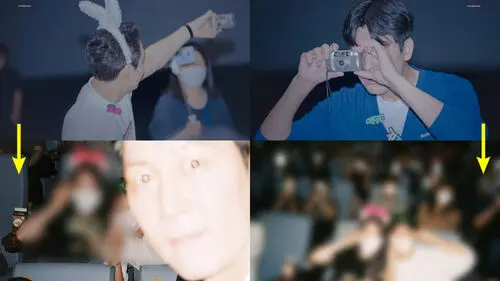 Jung Woo Sung put his eyes close to the camera, and took a photo of the fan and her friend in the seat, with a bunch of other people in the theater sitting behind them.