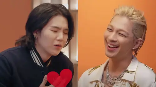 When TAEYANG entered the room, SUGA grabbed his chest and said, "Gosh, I'm so nervous right now. Look, there is a celebrity right in front of me. Is this happening for real? I'm your huge fan and I've been wanting to ask you so many things ever since when I was little. I even read your book."