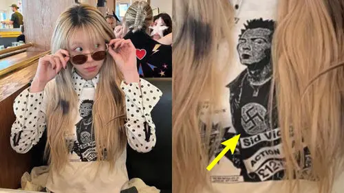 In the photos, CHAEYOUNG was wearing a T-shirt with a graphic of a 1970s picture of English punk rock band Sex Pistols' Sid Vicious wearing a T-shirt with a swastika on it.