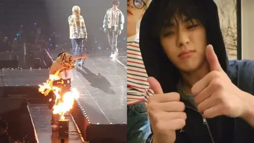 On his approaching the stage, member YOON JAE HYUK was struck by a flame from a special effect device.