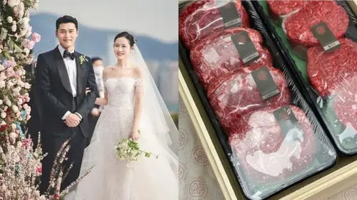 Alongside a photo of a set of Korean beef for steak and bulgogi (marinated beef), the neighbor wrote on her Instagram, "While I was out, my favorite star of all time Hyun Bin apparently rang our doorbell with a gift in his hand."