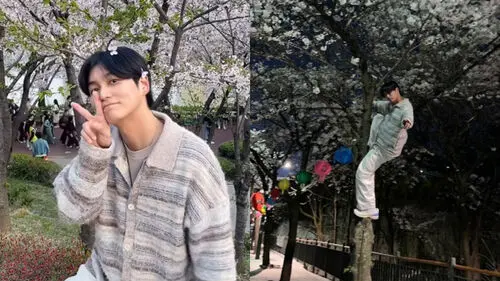 On April 10, Choi Sung-joon shared a photo on his Instagram, showing himself perched on a branch of a cherry blossom tree.