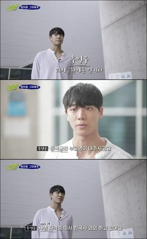 At that time, Choo Young-woo was a 21-year-old college student studying acting at the Korea National University of Arts. He briefly appeared on the show, where he answered questions from the production team about how he managed his college tuition and living expenses. He stated, "I earn my pocket money through tutoring, and my parents cover my tuition." He also elaborated on his tutoring, saying, "I was really interested in Korean history during middle and high school, so I got a teaching certificate and tutored Korean history."