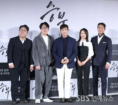 Actors Ko Chang-seok (from left), Hyun Bong-sik, Lee Byung-hun, Moon Jung-hee, and Jo Woo-jin attended the press conference for the movie 'Victory' held at CGV Yongsan I-Park Mall in Yongsan, Seoul, on the morning of the 7th, where they posed for photos.