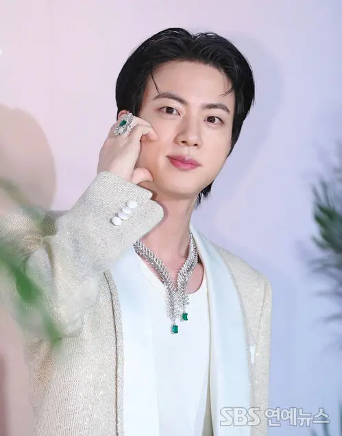 Jin from the global sensation BTS attended a jewelry brand's photo wall event held at the Chosun Palace Hotel in Gangnam, Seoul, on the afternoon of the 13th, striking a pose for the cameras.