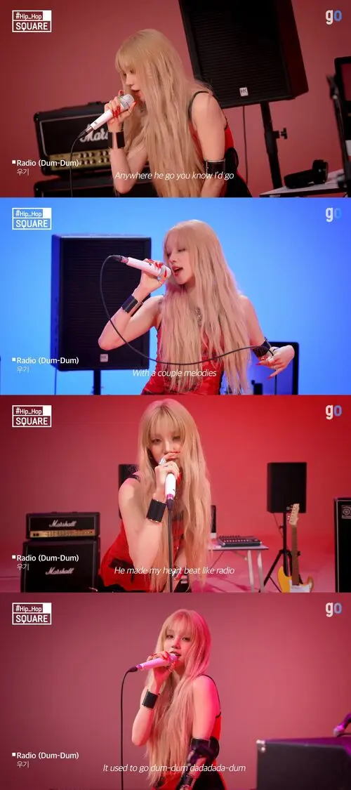 Additionally, YUQI showcased a live performance of "Radio (Dum-Dum)" on the Genie Music YouTube channel. The video features YUQI in funky attire, passionately performing the song from various angles. Her stage presence, highlighted by a creative arrangement and delicate vocals, evokes the image of a rock star.