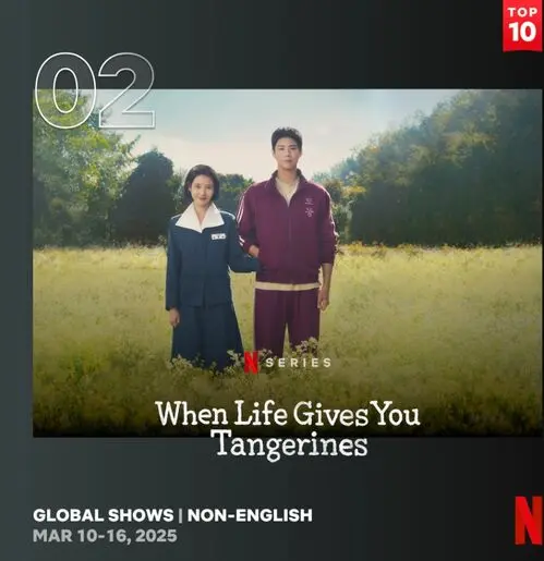 The Netflix series 'When Life Gives You Tangerines,' which narrates the adventurous lives of 'the rebellious spirit' Aesoon (played by IU and Moon So-ri) and 'the steadfast iron man' Gwansik (played by Park Bo-gum and Park Hae-joon) from Jeju Island, has recorded 6,000,000 views in its second week of release. This achievement has placed it at No. 2 in the Global TOP 10 Series (Non-English) category. The series is gaining popularity not only in South Korea but also in 41 countries, including Brazil, Chile, Mexico, Turkey, the Philippines, and Vietnam.